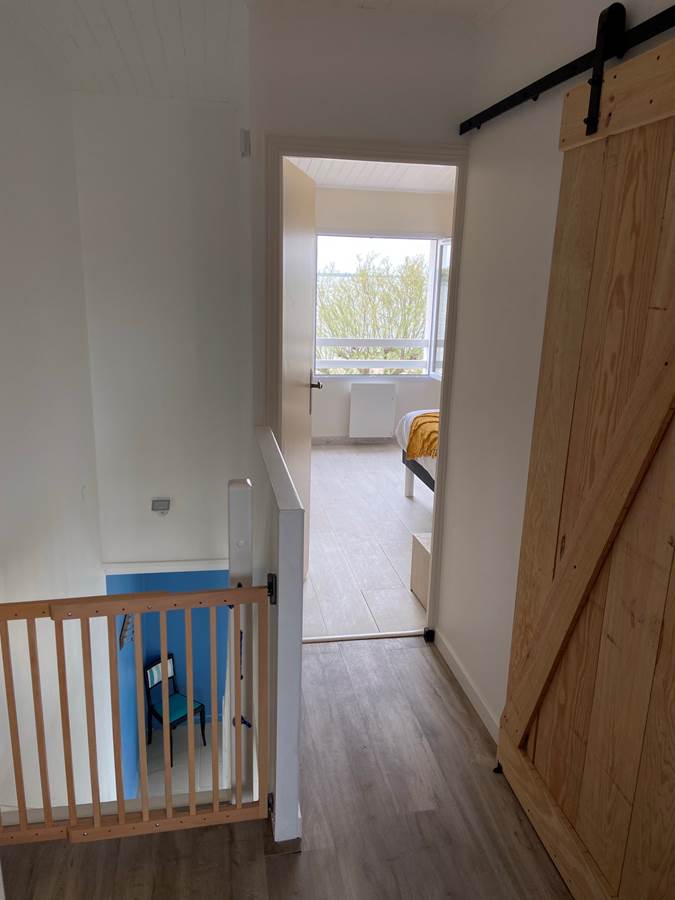 You will have two bedrooms upstairs: A master bedroom with sea view, a bedroom with two single beds with forest view and a bathroom.